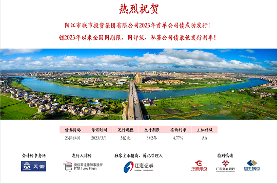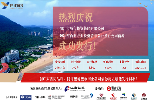 陽江市城市投資集團有限公司成立于2004年,是一家致力于推動陽江城市高質量發展的國有企業,目前陽江市國資委占股90%,廣東省財政廳占股10%。公司經營范圍:城市基礎設施和工業園區基礎設施項目投資建設,公用事業和社會公益性項目投資建設,土地整理,資產管理和營運,股權管理和營運,投資經營,投資收益的管理及再投資,財務咨詢,工程咨詢,國內貿易,投資教育業,市政府國有資產管理部門所授權的其他業務。陽江城投集團圍繞“城市發展命運共同體”定位,積極主動融入陽江市發展大局,將以“服務陽江、發展陽江,創新引領”為使命,不斷夯實主業發展基礎,培養產業競爭能力。立足陽江,面向大灣區,全力打造區域發展與產業引領的產城服務商。